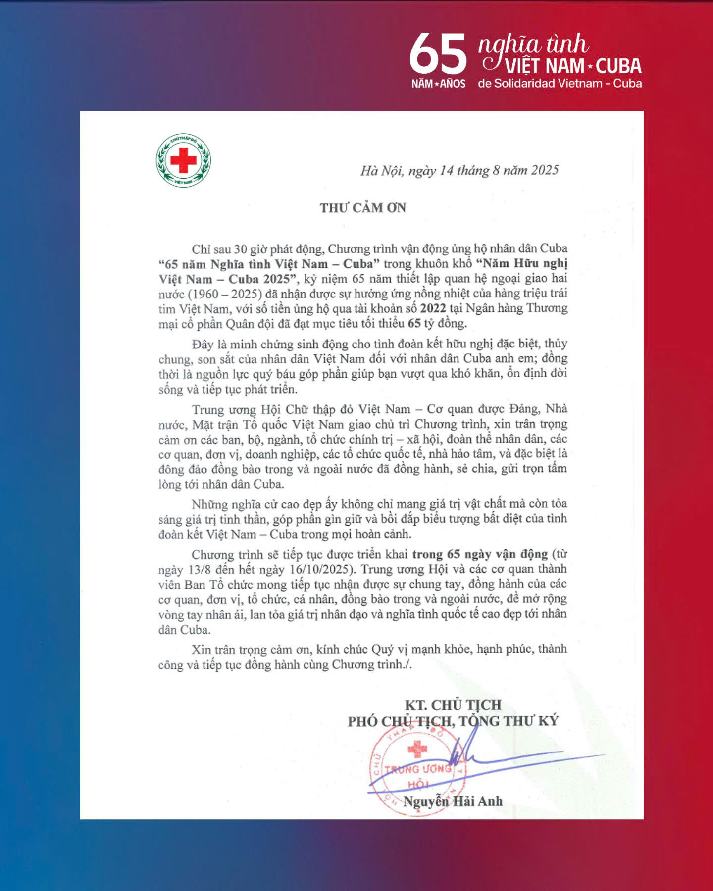 Trung ương Hội Chữ thập đỏ Việt Nam trân trọng cảm ơn các ban, bộ, ngành, tổ chức chính trị – xã hội, đoàn thể nhân dân, các cơ quan, đơn vị, doanh nghiệp, tổ chức quốc tế, nhà hảo tâm và đặc biệt là đông đảo đồng bào trong và ngoài nước đã đồng hành, sẻ chia, gửi trọn tấm lòng tới nhân dân Cuba.