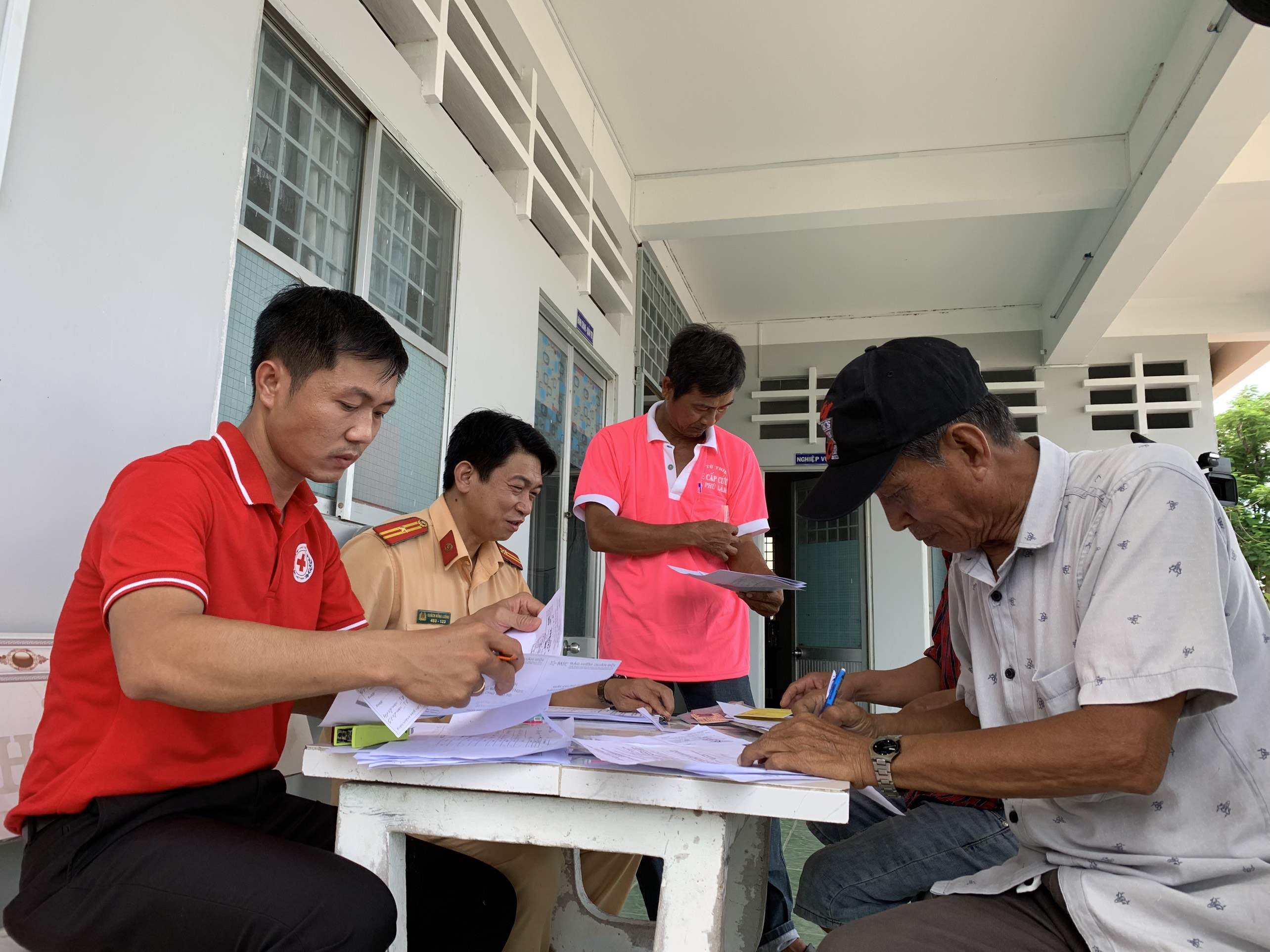 Cán bộ Hội Chữ thập đỏ tỉnh An Giang phối hợp Công an tỉnh An Giang kiểm tra và hướng dẫn Ban điều hành xe chuyển bệnh miễn phí các cấp Hội hoàn thiện hồ sơ thẩm định.