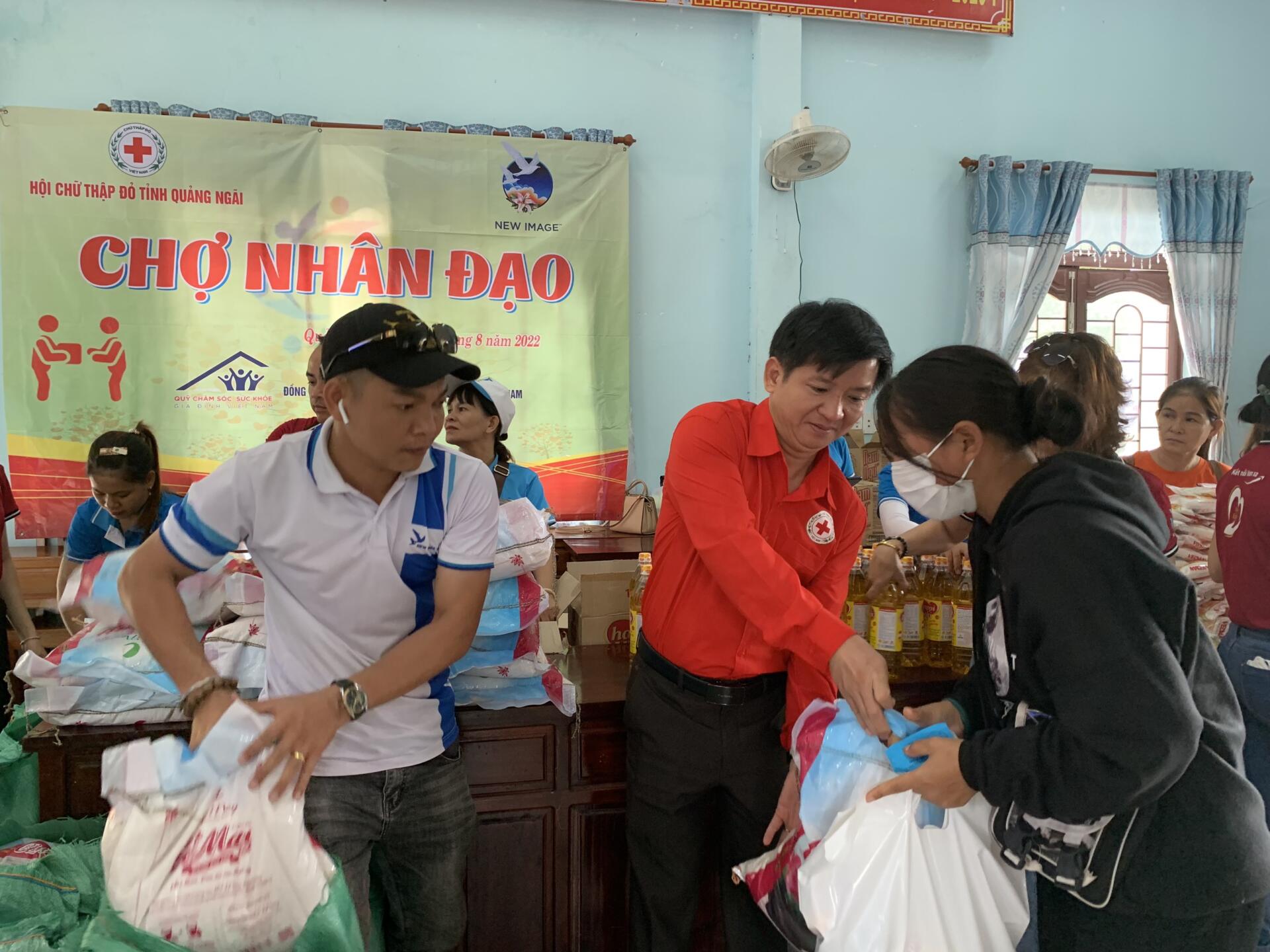 Chủ tịch Hội Chữ thập đỏ tỉnh Quảng Ngãi Phạm Ngọc Thành (áo đỏ) trao quà cho người dân xã Sơn Tinh tại phiên chợ Nhân đạo Phiên chợ tặng 300 suất quà với 5 mặt hàng là các nhu yếu phẩm đáp ứng như cầu cho người dân như: Gạo, dầu ăn, bọt ngọt,…