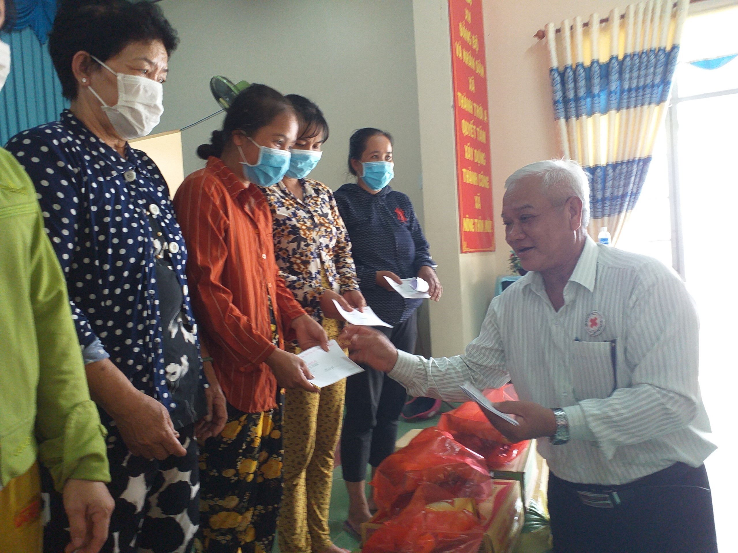 Ông Võ Văn Hoanh – Chủ tịch Hội Chữ thập đỏ tỉnh Bến Tre trao quà Tết cho các hộ nghèo xã An Thới, huyện Mỏ Cày Nam