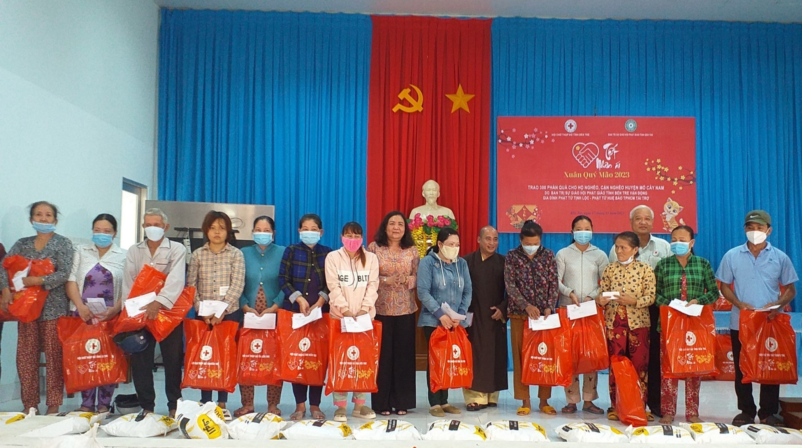 Được sự quan tâm, hỗ trợ của bà Hồ Thị Hoàng Yến và Đại Đức Thích Trí Thuận vận động gia đình Phật tử Tịnh Lộc – Huệ Bảo ở thành phố Hồ Chí Minh hỗ trợ, Đoàn đã trao tặng 300 phần quà cho các hộ nghèo, cận nghèo của huyện Mỏ Cày Nam. Mỗi phần quà gồm các nhu yếu phẩm và tiền mặt. Tổng trị giá trên 250 triệu đồng.