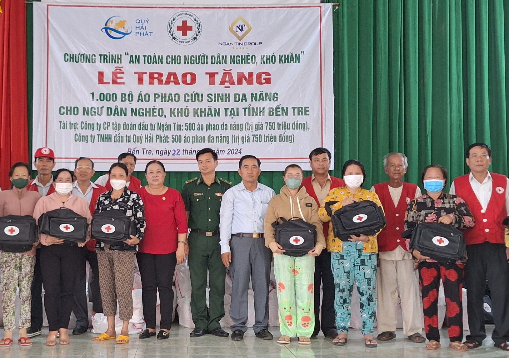 Mỗi bộ áo phao cứu sinh đa năng có trị giá 1.500.000 đồng. Mỗi túi sơ cấp cứu có trị giá là 365.000 đồng. Những bộ áo phao và dụng cụ y tế này hỗ trợ cho chủ tàu, ngư dân giảm thiểu những rủi ro không may xảy ra khi mưa to, sóng lớn và giúp ngư dân an tâm đánh bắt trên biển. Tổng trị giá hoạt động trao tặng 862 bộ áo phao cứu sinh đa năng và 135 túi sơ cấp cứu cho ngư dân nghèo, khó khăn tại huyện Ba Tri và Bình Đại trên 1,3 tỷ đồng. Đây là nguồn tài trợ do Nguyên Chủ tịch Nước Trương Tấn Sang và Trung ương Hội Chữ thập đỏ Việt Nam vận động Công ty Cổ phần Tập đoàn Đầu tư Ngân Tín và Công ty TNHH Đầu tư Quý Hải Phát hỗ trợ tặng bộ áo phao cứu sinh đa năng cho ngư dân nghèo, khó khăn tại Bến Tre.