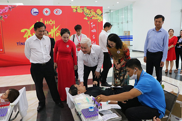 Các đại biểu thăm hỏi, động viên các tình nguyện viên tham gia hiến máu tại Lễ hội Xuân hồng năm 2023.