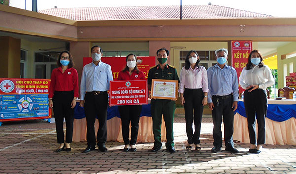 Đại diện Hội Chữ thập đỏ huyện Phú Giáo tiếp nhận bảng tượng trưng trao 200kg cá từ