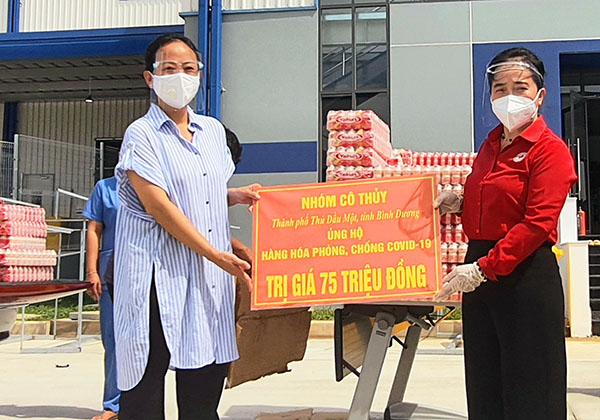 Sáng cùng ngày, Hội Chữ thập đỏ tỉnh đã tiếp nhận hàng hóa ủng hộ phòng, chống dịch Covid-19 trị giá 75 triệu đồng do Nhóm từ thiện cô Thủy ở TP.Thủ Dầu Một trao tặng để hỗ trợ cho tuyến đầu chống dịch. Từ đầu đợt dịch thứ 4 đến nay, Nhóm từ thiện cô Thủy luôn đồng hành, ủng hộ nguồn lực cho Hội Chữ thập đỏ tỉnh để thực hiện các hoạt động từ thiện xã hội, chia sẻ với người dân bị ảnh hưởng bởi dịch bệnh. Đặc biệt, Nhóm dành rất nhiều tình cảm, sự quan tâm chia sẻ đặc biệt và thường xuyên thông qua Hội Chữ thập đỏ tỉnh để gửi quà đến hỗ trợ các y, bác sĩ và lực lượng tuyến đầu chống dịch trên địa bàn tỉnh.