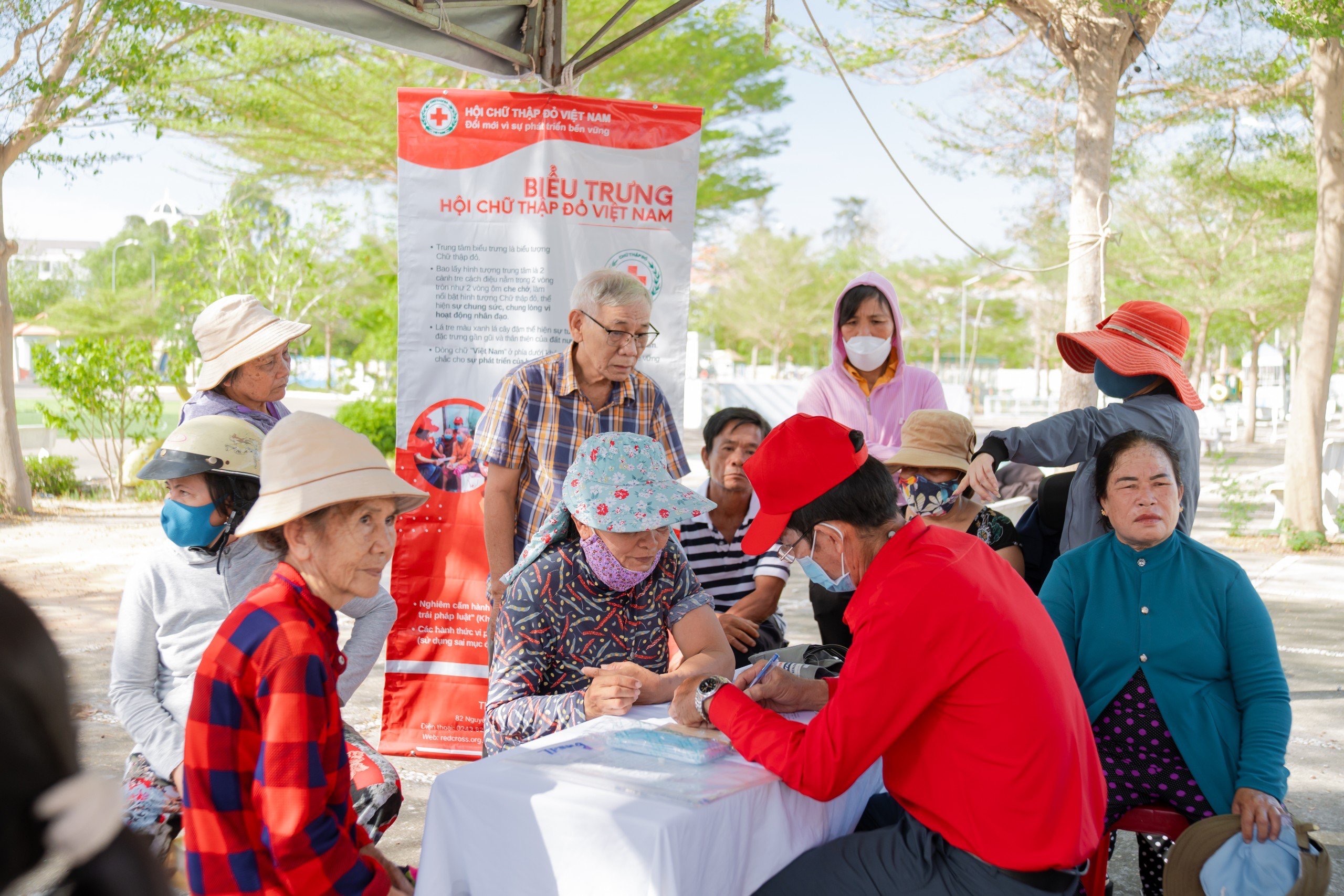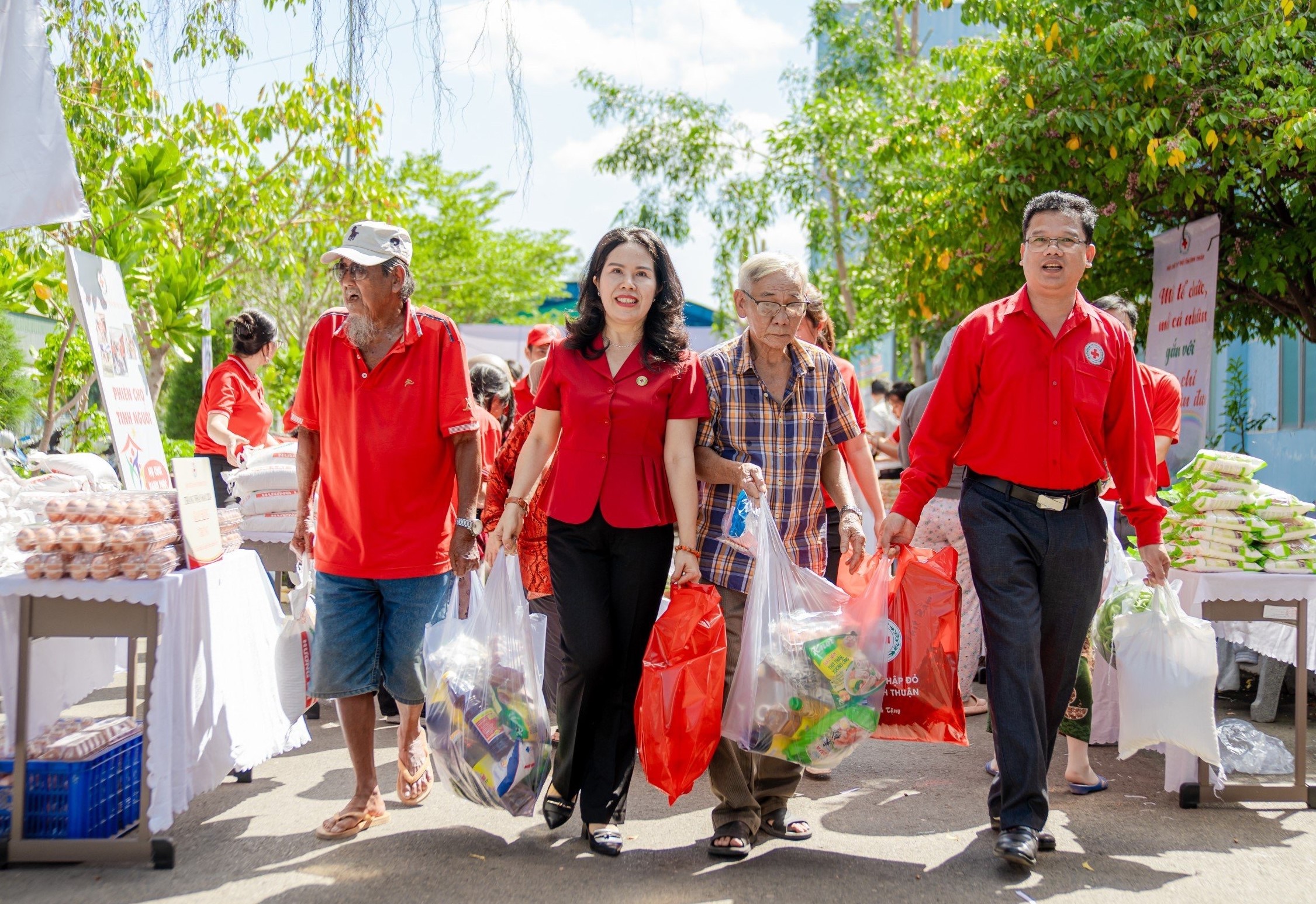Bên cạnh Lễ phát động “Tháng Nhân đạo” năm 2024, Hội Chữ thập đỏ tỉnh đã tổ chức phiên chợ nhân đạo và khám bệnh cấp thuốc cho 100 hộ nghèo, có hoàn cảnh khó khăn trên địa bàn TP. Phan Thiết. Phiên chợ có 19 gian hàng với các mặt hàng là các nhu yếu phẩm hàng ngày cho người dân như: gạo, mì tôm, đường, xì dầu, dầu ăn, nước mắm, trứng, sữa… Mỗi người dân được tham gia phiên chợ nhân đạo với hình thức cấp phiếu đổi hàng miễn phí trị giá 700.000 đồng và được khám bệnh cấp thuốc miễn phí.