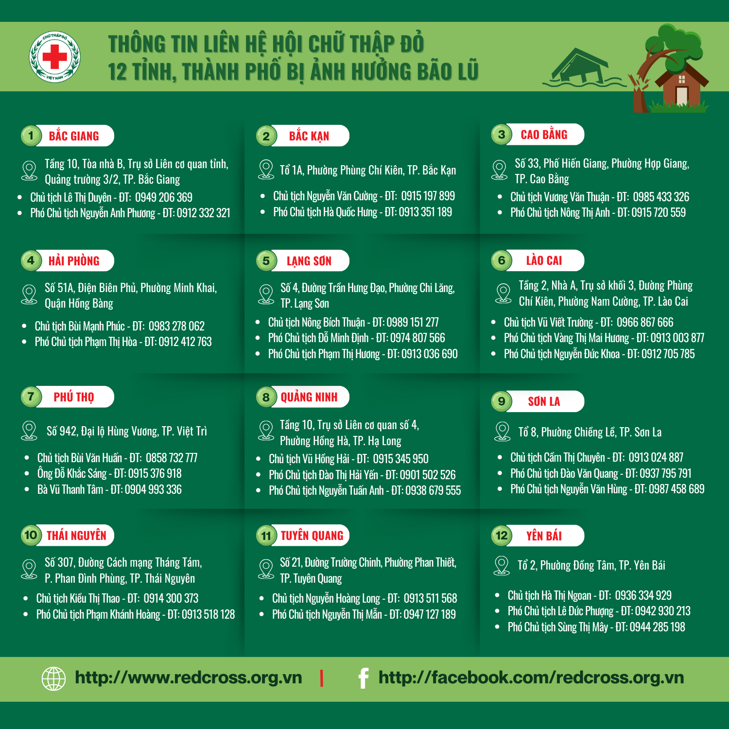 Trung ương Hội Chữ thập đỏ Việt Nam công bố thông tin liên hệ của Hội Chữ thập đỏ 12 tỉnh, thành phía Bắc bị ảnh hưởng nặng nề do bão lũ để hỗ trợ các địa phương trong cả nước, các đoàn cứu trợ làm tốt hơn công tác hỗ trợ, điều phối, đáp ứng thiết thực nhu cầu của người dân hiện nay.