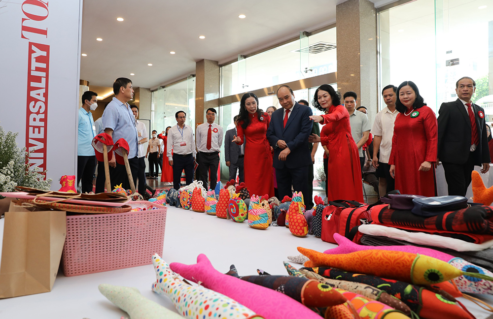 Chủ tịch nước Nguyễn Xuân Phúc tham quan gian hàng của Công ty Kym Việt, một trong những doanh nghiệp xã hội có lao động là người khuyết tật.