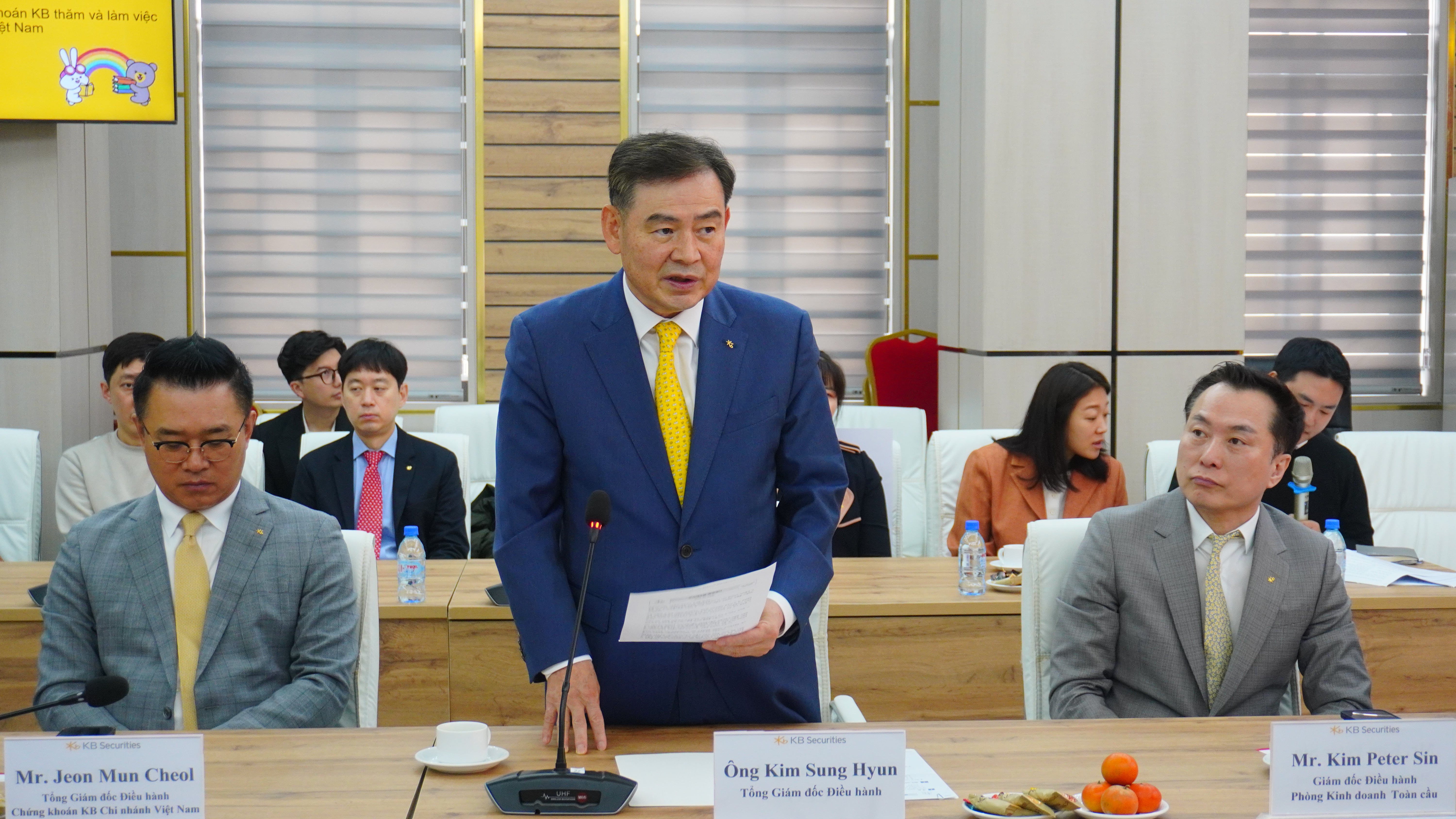 Phát biểu tại buổi làm việc, ông Kim Sung Hyun, Giám đốc Điều hành Công ty Chứng khoán KB, chia sẻ: “Từ khi mở rộng hoạt động tại Việt Nam vào năm 2007, chúng tôi đã triển khai nhiều dự án trách nhiệm xã hội, đặc biệt là dự án lớp học cầu vồng, với mong muốn cải thiện môi trường giáo dục cho trẻ em. Chúng tôi hy vọng rằng những đóng góp nhỏ bé này sẽ góp phần vào sự phát triển bền vững của thế hệ tương lai. Ngoài ra, chúng tôi cũng đặc biệt quan tâm đến vấn đề biến đổi khí hậu toàn cầu. Năm nay, chúng tôi triển khai dự án trồng rừng ngập mặn nhằm ứng phó với biến đổi khí hậu và phòng chống thiên tai tại Việt Nam.”