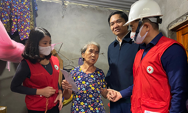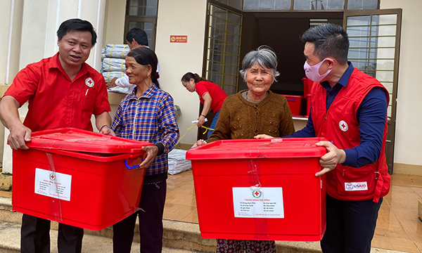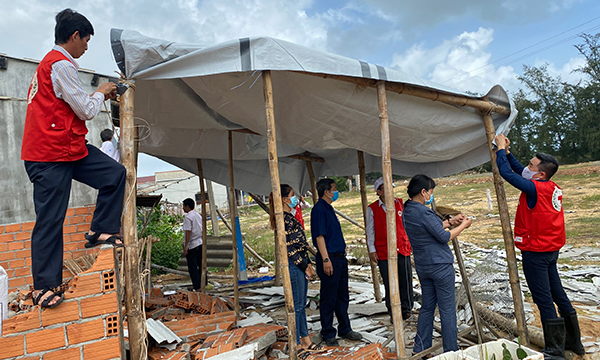Đoàn công tác Trung ương Hội và các tình nguyện viên tặng bộ dụng cụ sửa nhà và giúp ng dân có nhà sập chăng bạt lấy chỗ ở tạm
