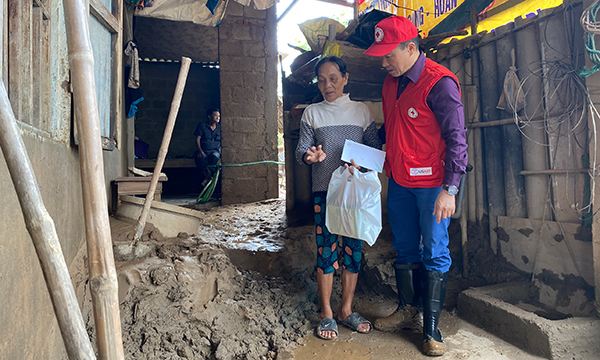 Chiều cùng ngày (21/10), Đoàn công tác Chữ thập đỏ Việt Nam tiếp tục tới thăm, tặng quà người dân xã Sơn Thủy, huyện Lệ Thủy, tỉnh Quảng Bình. Huyện Lệ Thủy là địa phương chịu thiệt hại nặng nề nhất của Quảng Bình, với khoảng 32.000 nhà bị ngập nước