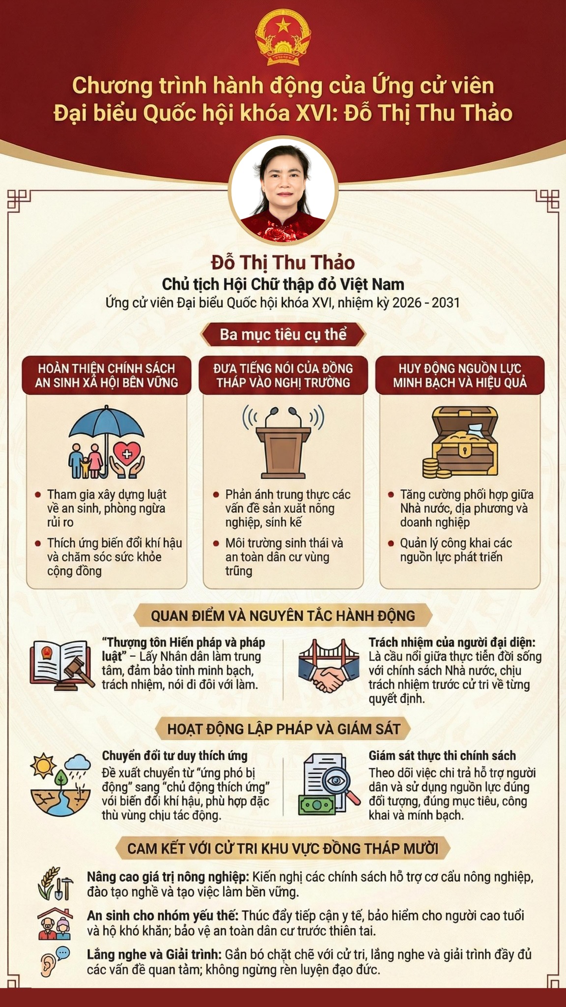 Đối với địa bàn Đồng Tháp Mười – nơi bà ứng cử, bà Đỗ Thị Thu Thảo đặc biệt quan tâm đến việc nâng cao giá trị nông nghiệp, phát triển kinh tế nông thôn bền vững và bảo đảm an sinh cho các nhóm yếu thế. Trong chương trình hành động, bà đề xuất nhiều giải pháp cụ thể như hỗ trợ tái cơ cấu nông nghiệp theo hướng giảm rủi ro và tăng giá trị; thúc đẩy đào tạo nghề và tạo việc làm cho người lao động; tăng cường tiếp cận dịch vụ y tế, bảo hiểm cho người cao tuổi và hộ khó khăn; đồng thời nâng cao năng lực phòng ngừa, ứng phó thiên tai nhằm bảo vệ an toàn cho cộng đồng dân cư.