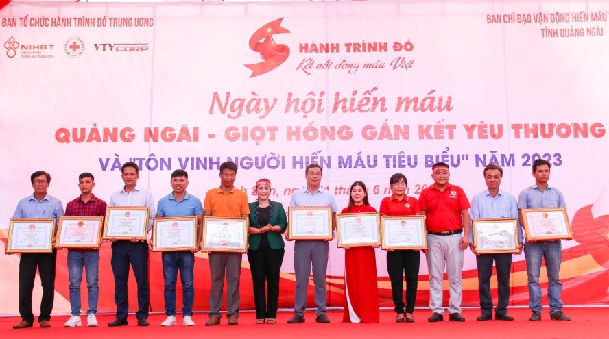 Đặc biệt, chương trình còn tôn vinh những người hiến máu tiêu biểu, những tấm gương sáng về lòng nhân ái và tinh thần đóng góp cho cộng đồng. Những cá nhân này đã đóng vai trò quan trọng trong việc lan tỏa thông điệp về hiến máu tình nguyện và trở thành nguồn động viên lớn cho những người khác tham gia. Nhân dịp này, Ban tổ chức đã trao tặng Bằng khen của Chủ tịch UBND tỉnh Quảng Ngãi cho 12 gia đình, 14 cá nhân đã có thành tích tiêu biểu trong phong trào hiến máu tình nguyện nhân ngày “Thế giới tôn vinh người hiến máu” ngày 14/6 và Giấy khen của Ban Chỉ đạo vận động hiến máu tình nguyện tỉnh cho 40 cá nhân có nhiều thành tích trong phong trào hiến máu.