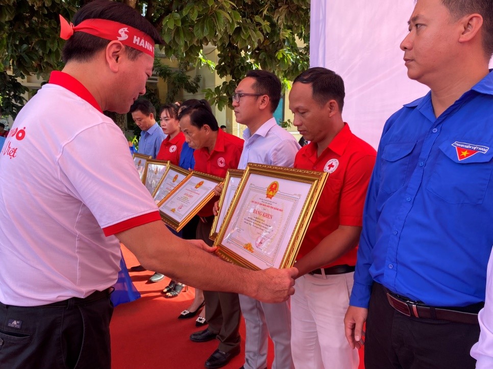 Ông Tôn Thất Minh Trí – Phó Giám đốc Trung tâm Truyền máu khu vực Huế, thành viên Ban tổ chức Hành trình đỏ Trung ương trao tặng bằng khen cho các cá nhân có nhiều thành tích trong phong tràohiến máu.