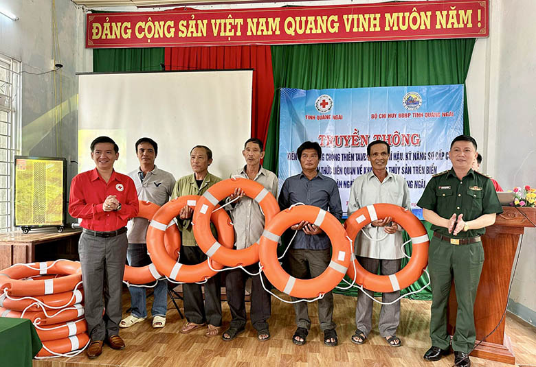 Ngày 8/11/2023, tại Nhà văn hóa thôn An Kỳ, xã Tịnh Kỳ, TP Quảng Ngãi, Hội Chữ thập đỏ tỉnh Quảng Ngãi phối hợp với Ban Chỉ huy Bộ đội Biên phòng tỉnh, Chi cục Thuỷ sản tổ chức Truyền thông kiến thức phòng chống thiên tai/Biến đổi khí hậu, kỹ năng sơ cấp cứu và phổ biến kiến thức về hoạt động khai thác thuỷ sản trên biển cho 50 ngư dân nghèo, khó khăn năm 2023.
