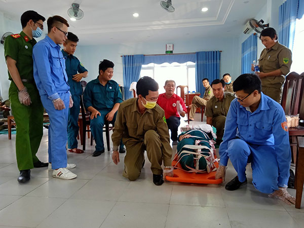 Sau khi được chia sẻ kiến thức và kỹ năng một số kỹ thuật cơ bản sơ cấp cứu thì lớp tập huấn còn chia thành những nhóm nhỏ để thực hành các tình huống giả định.