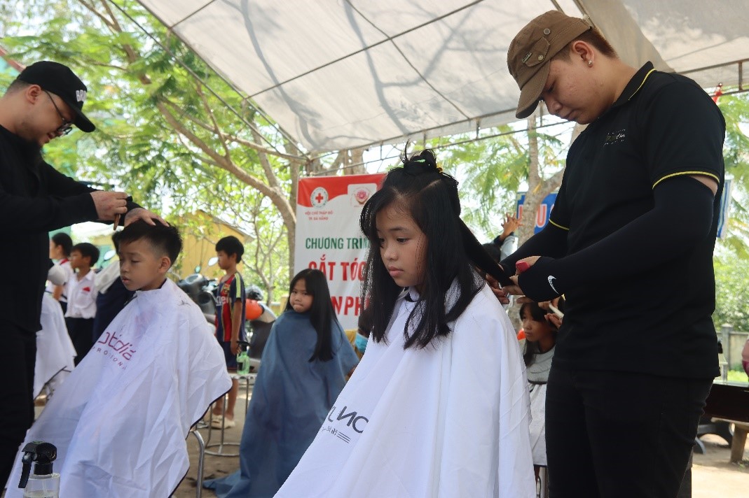 Công ty Nutifood cũng đã hỗ trợ cho các em những lốc sữa nước dinh dưỡng. Cầm những lốc sữa trên tay, gương mặt ai cũng rạng ngời hạnh phúc… Các anh chị ở Nhóm câu lạc bộ Tự nguyện Hòa Vang cũng sẵn sàng phục vụ cắt tóc miễn phí. Những kiểu đầu mới được cắt tỉa gọn gàng, sẵn sàng cho các em có mùa hè năng động.