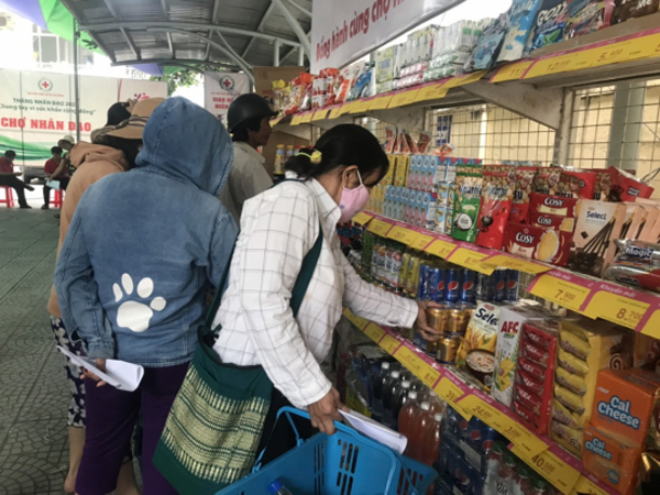 Tại Phiên chợ, Hội Chữ thập đỏ thành phố hỗ trợ 500 phiếu mua hàng miễn phí (có giá trị sử dụng một lần) cho 500 người đến mua hàng, mỗi phiếu trị giá 150.000 đồng cho các hộ có hoàn cảnh khó khăn trên địa bàn quận Hải Châu và quận Thanh Khê. Phiên chợ với đầy đủ các mặt hàng phong phú, từ gạo, nước mắm đến dầu ăn, nước ngọt , bánh kẹo…
