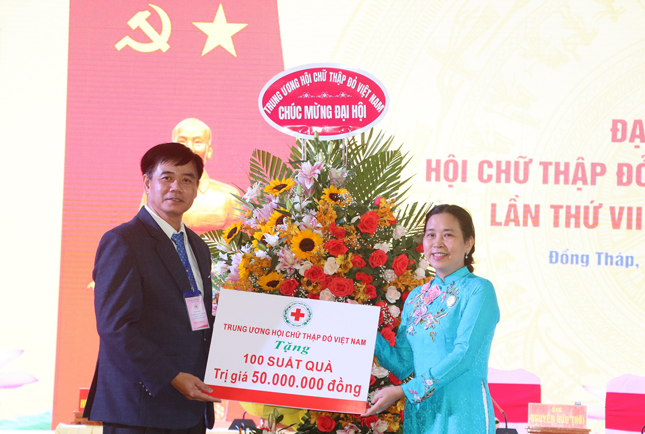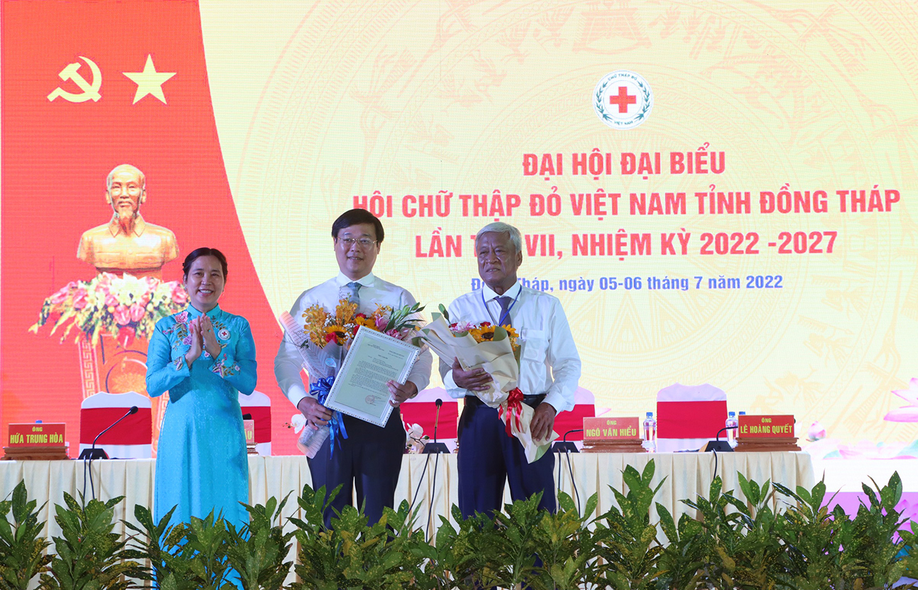 Bà Huỳnh Thị Xuân Lam – Phó Chủ tịch Trung ương Hội Chữ thập đỏ Việt Nam và ông Lê Quốc Phong – Bí thư Tỉnh ủy Đồng Tháp tặng hoa chúc mừng Ban Chấp hành Hội Chữ thập đỏ tỉnh Đồng Tháp khóa VII
