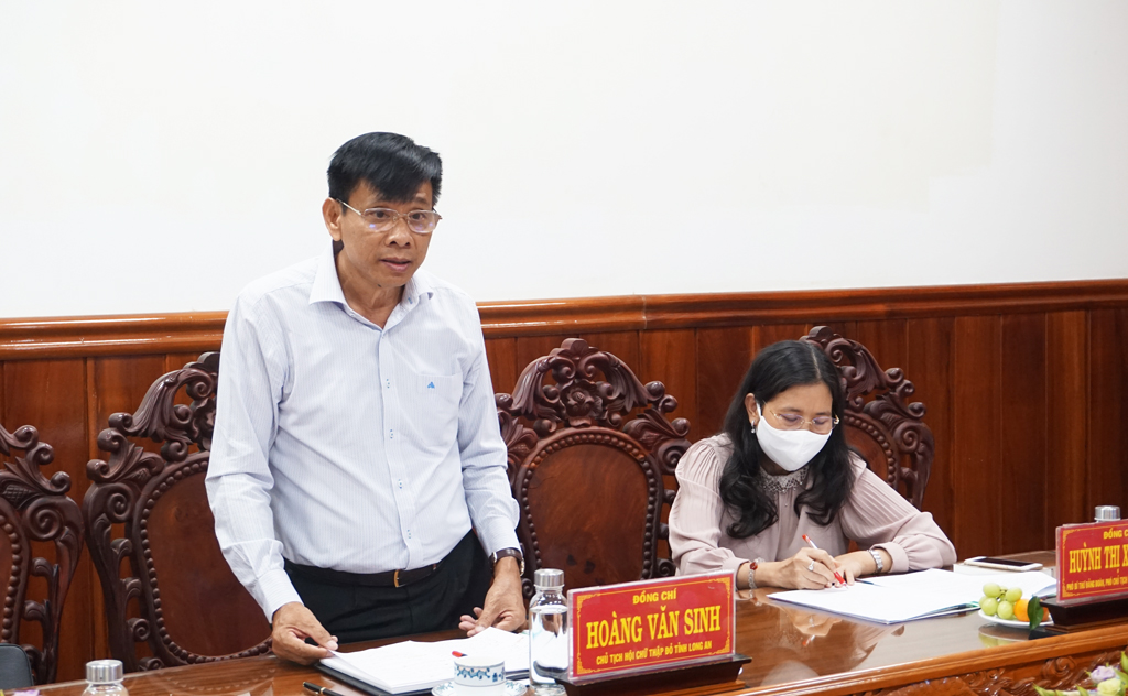 Chủ tịch Hội Chữ thập đỏ tỉnh Long An Hoàng Văn Sinh báo cáo với Đoàn công tác một số khó khăn về hoạt động Hội trong thời gian qua