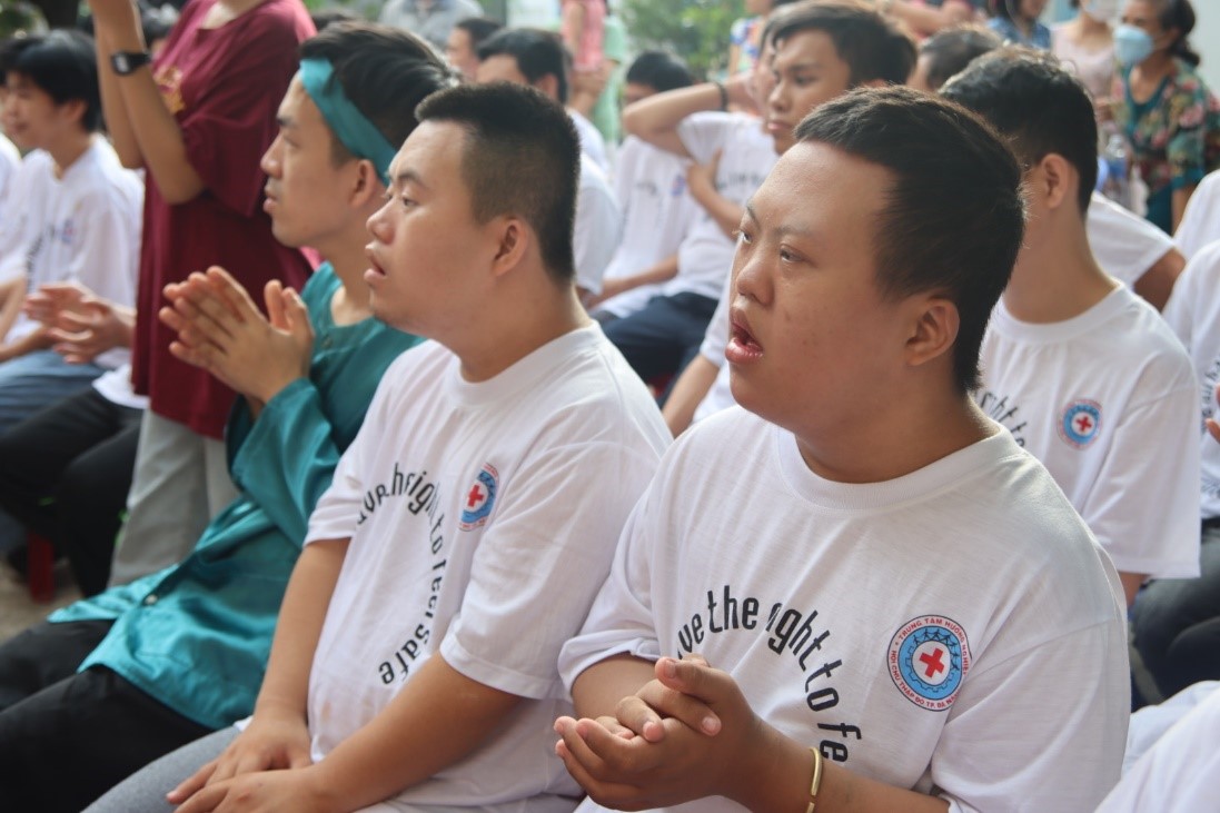 Bạn học viên khuyết tật của Trung tâm biểu diễn văn nghệ trong chương trình âm nhạc.