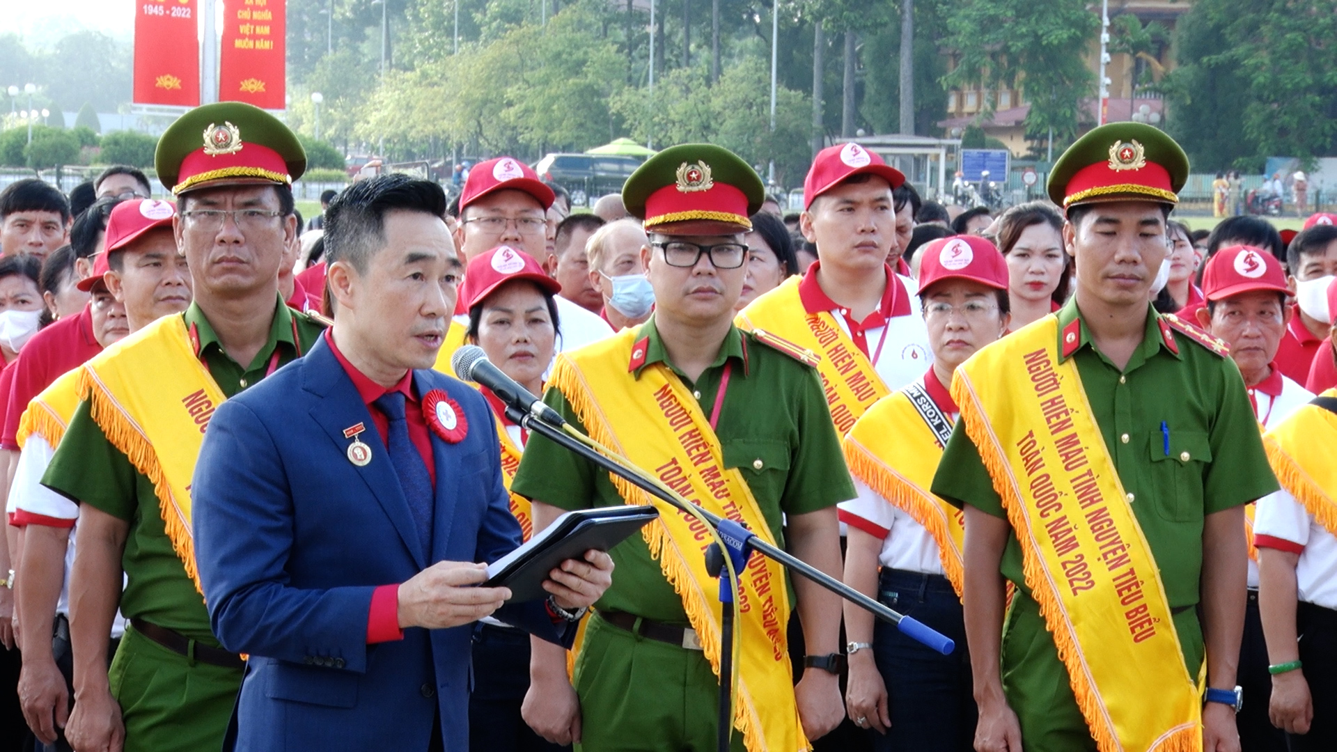 Thay mặt Đoàn đại biểu, Tổng Thư ký, Phó Chủ tịch Hội Chữ thập đỏ Việt Nam Nguyễn Hải Anh báo cáo: “Hôm nay, với niềm vinh dự, tự hào và xúc động được đại diện cho hơn 7 triệu cán bộ, hội viên, tình nguyện viên, thanh thiếu niên Chữ thập đỏ cả nước về dự Đại hội XI và Lễ tôn vinh Người hiến máu tiêu biểu năm 2022, trước anh linh Bác. Chúng cháu xin hứa sẽ tích cực tham gia và nỗ lực đóng góp trí tuệ, tâm huyết để Đại hội XI thành công tốt đẹp, đặc biệt là cùng toàn Hội tiếp tục phát huy truyền thống đoàn kết, nhất trí, chủ động, sáng tạo, nỗ lực vượt khó và tình yêu thương nhân ái, hết lòng vì sự nghiệp nhân đạo cao cả mà Bác đã định hướng, chỉ đường; tiếp tục làm sâu sắc hơn những lời minh huấn của Bác, xây dựng Hội Chữ thập đỏ Việt Nam ngày càng vững mạnh, phát huy hiệu quả vai trò nòng cốt trong công tác nhân đạo, tích cực thực hiện chính sách an sinh xã hội của Đảng, Nhà nước”.
