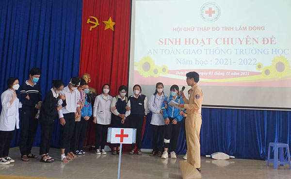 Chiều cùng ngày, tại Trường Trung học phổ thông P’ró, xã P’ró – Hội Chữ thập đỏ tỉnh Lâm Đồng phối hợp với Ban giám hiệu nhà trường tổ chức sinh hoạt chuyên đề về an toàn giao thông cho 300 học sinh của nhà trường với thông điệp “Niềm vui theo em đến trường là sự an toàn trên từng bước đi”. Tại đây, các em được trang bị kiến thức về luật giao thông đường bộ, thông qua làm bài trắc nghiệm gồm 25 câu hỏi; học sinh tự xây dựng tiểu phẩm liên quan đến giao thông và phương pháp xử lý theo luật giao thông tại tiểu phẩm đó. Ngoài ra, các em còn được trang bị thêm kiến thức xã hội khác thông qua câu hỏi giao lưu của Ban tổ chức.