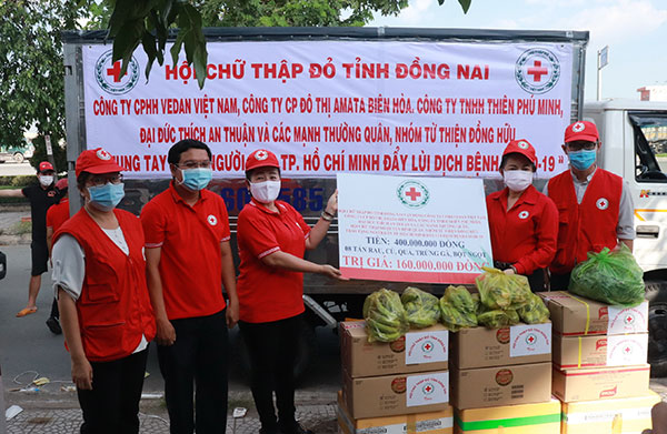 Cùng hướng về TP.Hồ Chí Minh, chia sẻ với những vất vả của người dân thành phố trong tình hình dịch bệnh Covid -19 tăng nhanh và diễn biến phức tạp trong thời gian vừa qua, Hội Chữ thập đỏ tỉnh Đồng Nai đã vận động trao tặng người dân TP.Hồ Chí Minh tổng cộng 560 triệu đồng, trong đó có 400 triệu đồng tiền mặt cùng với 8 tấn rau, củ, quả, trứng gà, bột ngọt trị giá 160 triệu đồng.