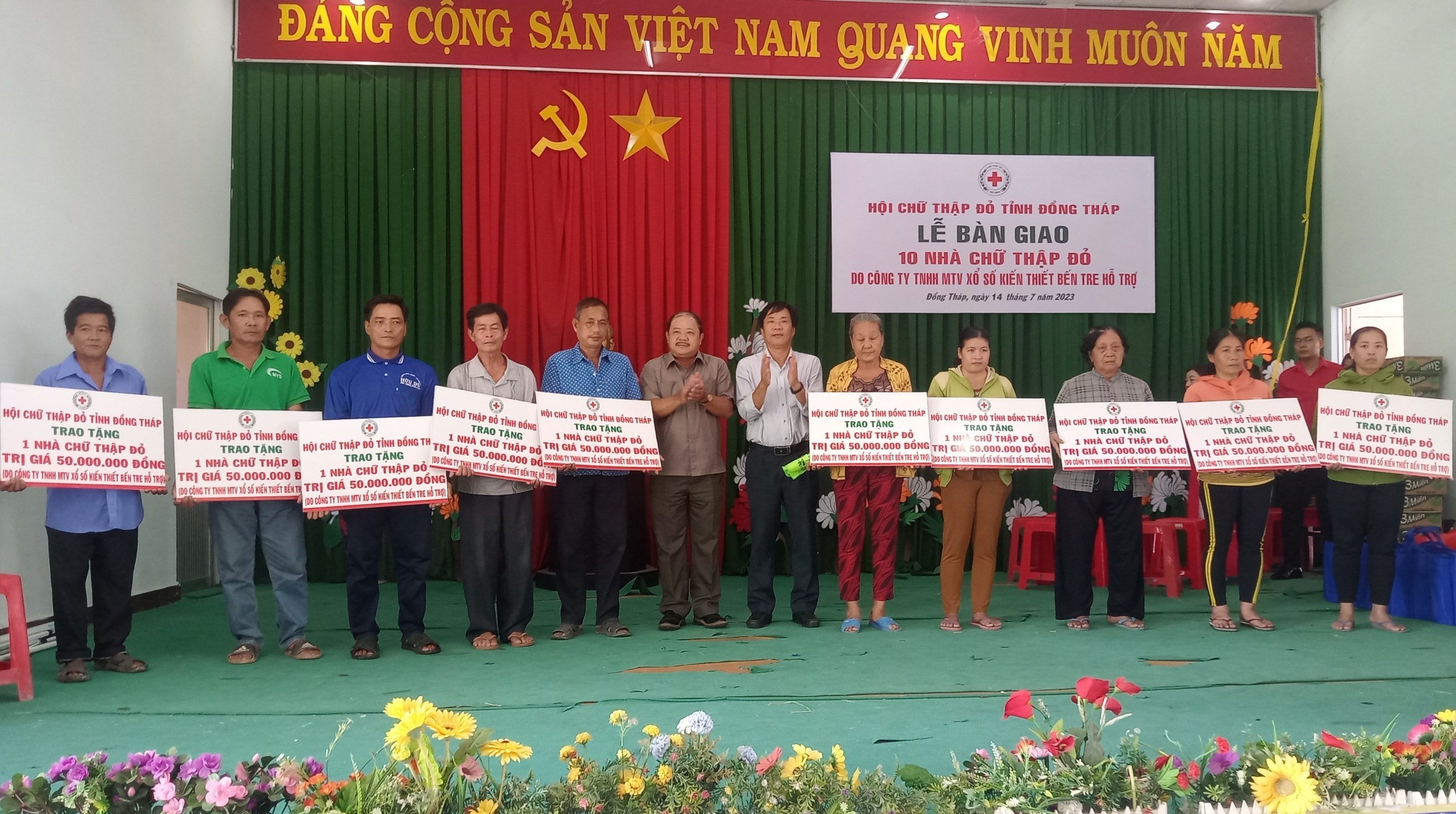 Công ty TNHH MTV Xổ số Kiến thiết Bến Tre hỗ trợ thông qua Hội Chữ thập đỏ tỉnh Đồng Tháp 10 căn nhà Chữ thập đỏ, mỗi căn 50.000.000 đồng, tổng số tiền 500.000.000 đồng.