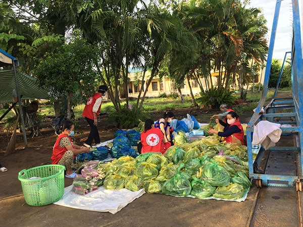 Cán bộ, hội viên, tình nguyện viên Chữ thập đỏ tham gia phân loại các loại rau, củ, quả.