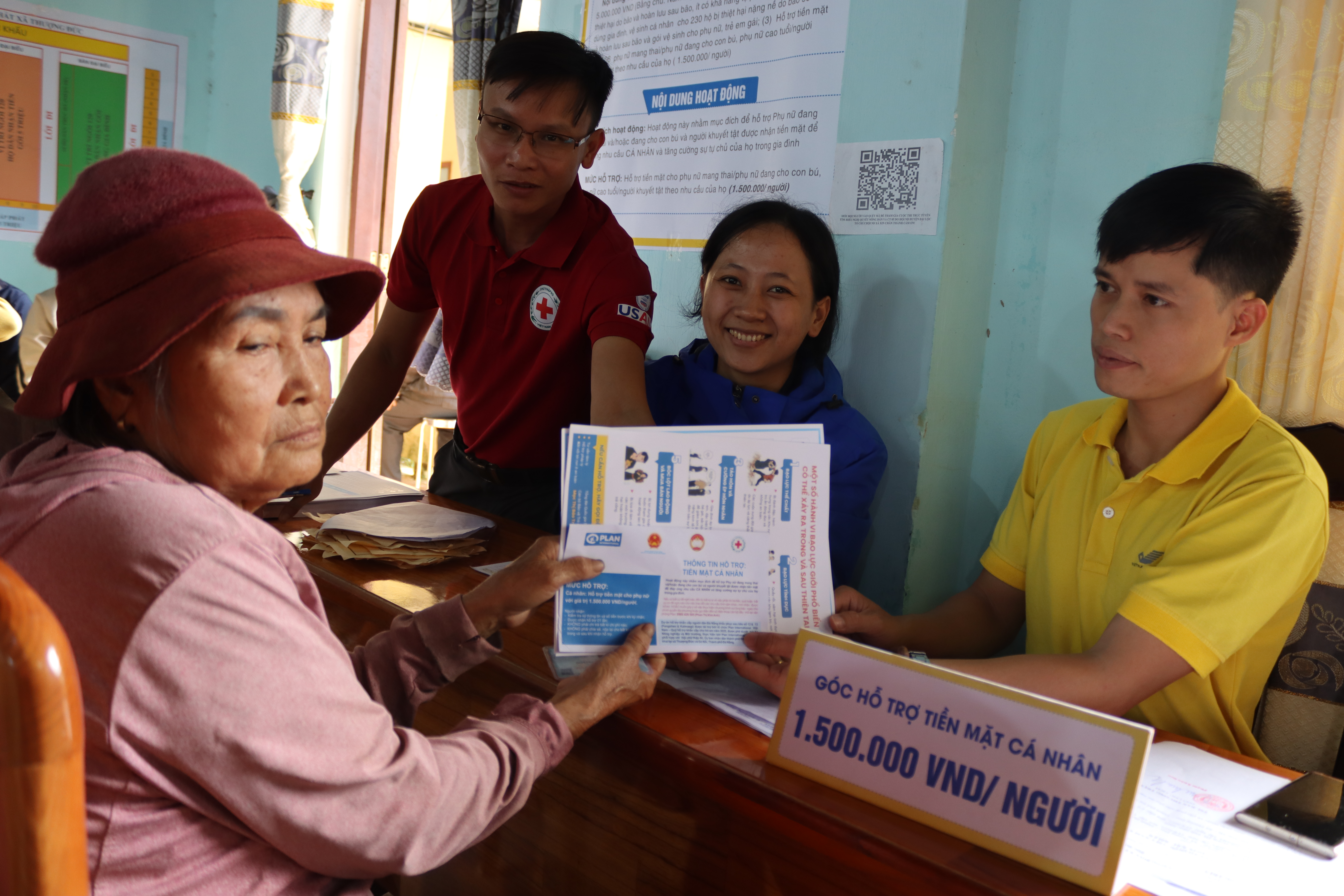 Trong đợt này, 296 hộ gia đình thuộc các nhóm dễ bị tổn thương bị ảnh hưởng sau bão số 12 và 13 được hỗ trợ theo ba hình thức, phù hợp với mức độ thiệt hại. Cụ thể, các hộ bị thiệt hại nặng được hỗ trợ 5 triệu đồng tiền mặt/hộ để khắc phục hậu quả, ổn định sinh hoạt; phụ nữ yếu thế, phụ nữ mang thai hoặc đang nuôi con nhỏ được hỗ trợ 1,5 triệu đồng/người nhằm giảm bớt khó khăn trong chăm sóc sức khỏe và đời sống; đồng thời, nhiều hộ dân được trao gói hàng hóa gia đình và gói vệ sinh trị giá 1,3 triệu đồng/hộ, đáp ứng nhu cầu thiết yếu trong giai đoạn phục hồi sau bão.