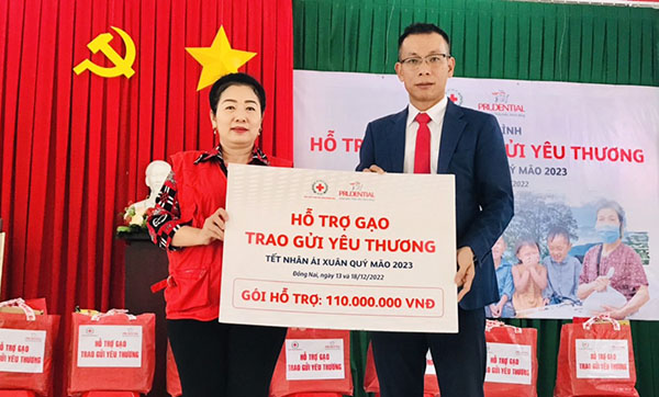 Đại diện Công ty TNHH Bảo hiểm Nhân thọ Prudencial Việt Nam trao biểu tượng 110 triệu đồng hỗ trợ quà Tết cho người dân khó khăn ở Đồng Nai.