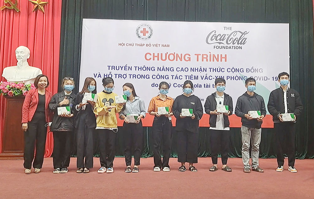 Các tình nguyện viên Chữ thập đỏ hướng dẫn cách đeo khẩu trang đúng cách cho các bạn sinh viên.