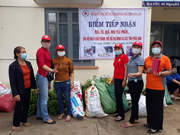 Hưởng ứng lời kêu gọi của Hội Chữ thập đỏ tỉnh về hỗ trợ người dân bị ảnh hưởng Covid -19, trong thời gian vừa qua, Hội Chữ thập đỏ huyện Krông Pắc đã tích cực vận động và tổ chức chuyến xe chở 20 tấn rau, củ, quả, nhu yếu phẩm hỗ trợ bà con nghèo tại các tỉnh bị ảnh hưởng bởi dịch bệnh, cụ thể: Hỗ trợ 3.5 tấn gạo, 80 thùng mì tôm, 3.600 trứng gà, rau, củ, quả các loại và một số nhu yếu phẩm cho người dân TP.Hồ Chí Minh, trị giá hơn 324 triệu đồng và tổ chức 01 chuyến xe chở hàng hoá hỗ trợ người dân tỉnh Bà Rịa – Vũng Tàu gồm: 1.6 tấn gạo, 2 tấn rau, củ quả và một số nhu yếu phẩm, trị giá 50 triệu đồng.