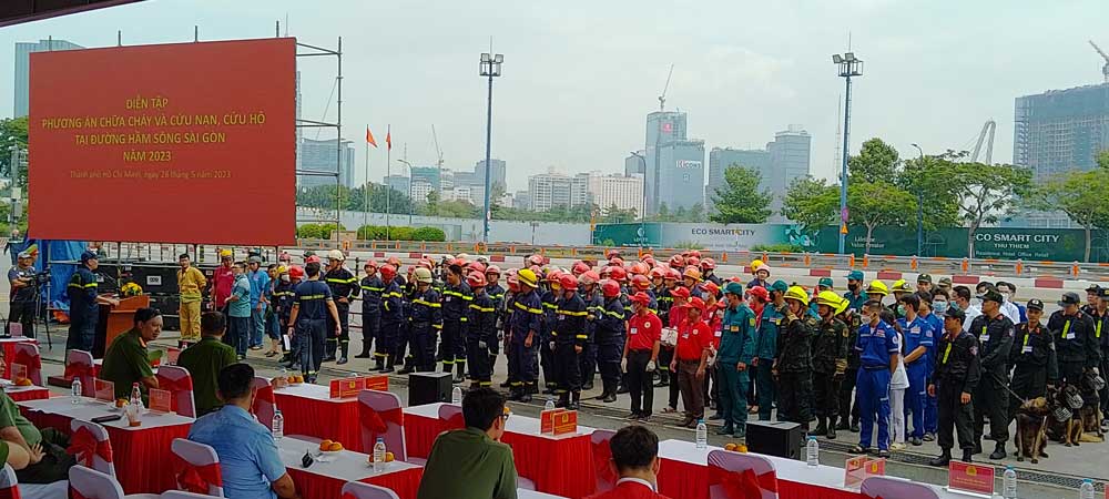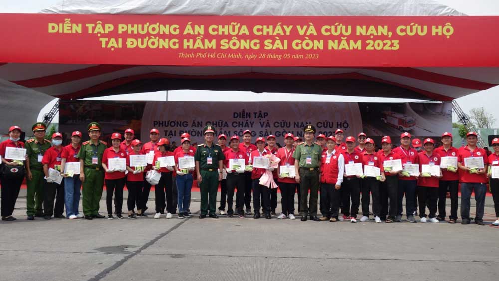 Từ ngày 19/5 đến 28/5/2023, Hội Chữ thập đỏ Thành phố Hồ Chí Minh cử 60 tình nguyện viên sơ cấp cứu 03 xe sơ cấp cứu tham gia luyện tập, hợp luyện 6 ngày 20/5 – 25/5 từ 19 giờ 00 đến 23 giờ 00; tổng duyệt ngày 27/5 từ 7 giờ 00 đến 11 giờ 00 và diễn tập chính thức ngày 28/5/2023 từ 7 giờ 00 đến 11 giờ 00 đồng hành với hơn 1.200 người, 88 xe cứu hỏa, cứu thương các loại cùng tham gia buổi diễn tập chữa cháy và cứu nạn, cứu hộ trong hầm vượt sông Sài Gòn (hầm Thủ Thiêm, TP Hồ Chí Minh)