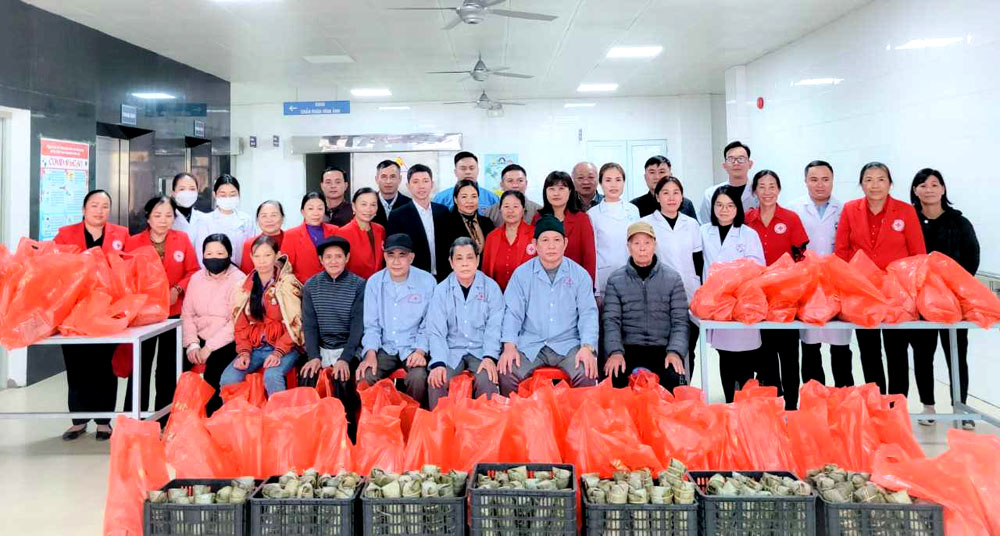 Các bệnh nhân đang điều trị tại Trung tâm Y tế thị trấn Ba Chẽ nhận bánh chưng, quà tặng của các nhà hảo tâm và tình nguyện viên.