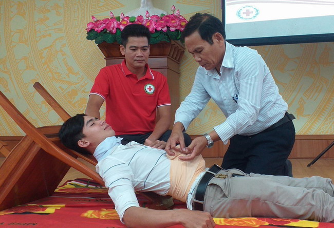 Ông Phạm Văn Dư – Phó Chủ tịch Hội CTĐ Bình Định thị phạm công tác sơ cấp cứu nạn nhân tại buổi tập huấn.