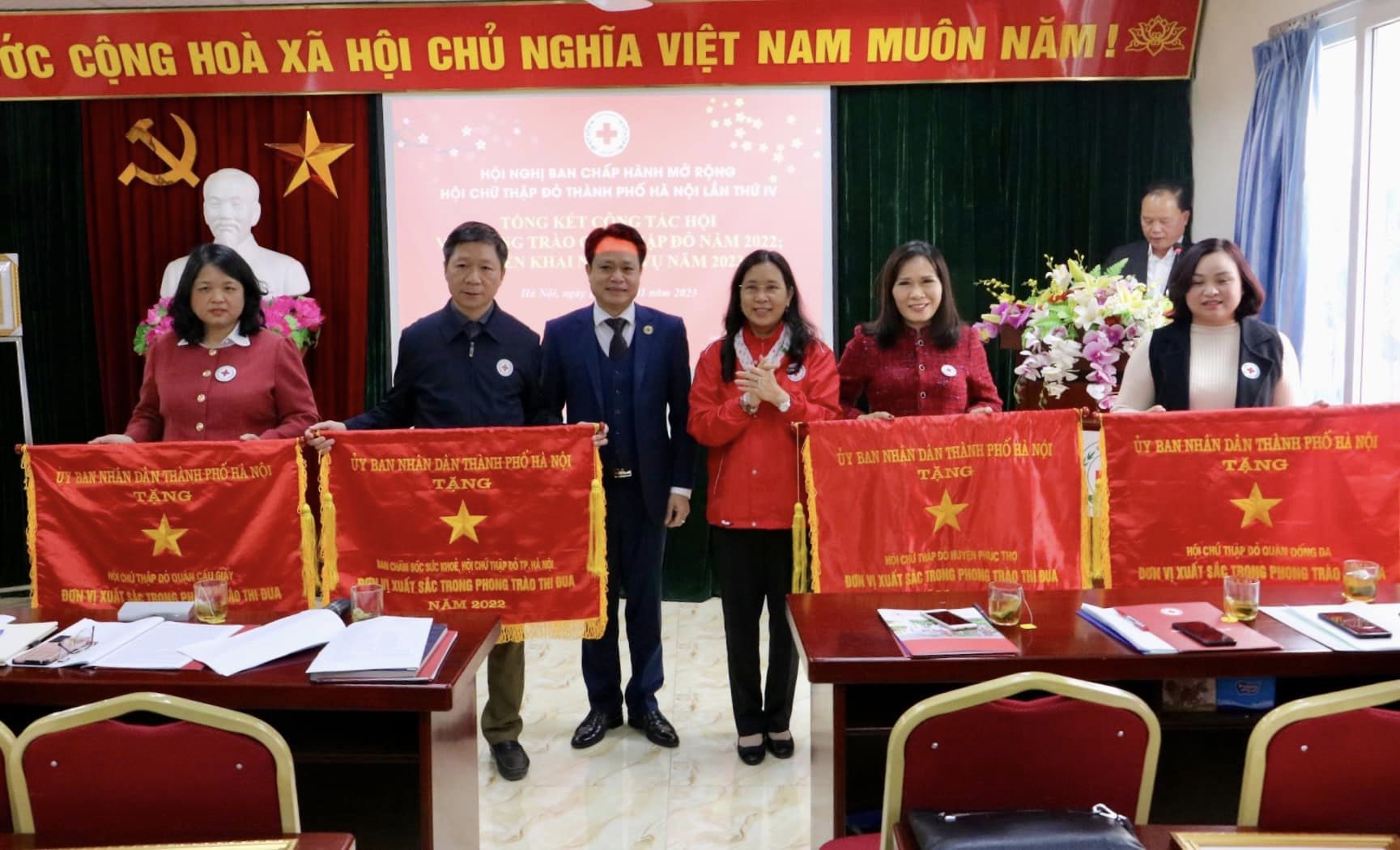 Phó Chủ tịch Hội Chữ thập đỏ Việt Nam Huỳnh Thị Xuân Lam và ông Đào Ngọc Triệu – Chủ tịch Hội Chữ thập đỏ Thành phố Hà Nội trao Cờ thi đua tới các tập thể, cá nhân có thành tích xuất sắc trong công tác Hội và phong trào Chữ thập đỏ năm 2022.