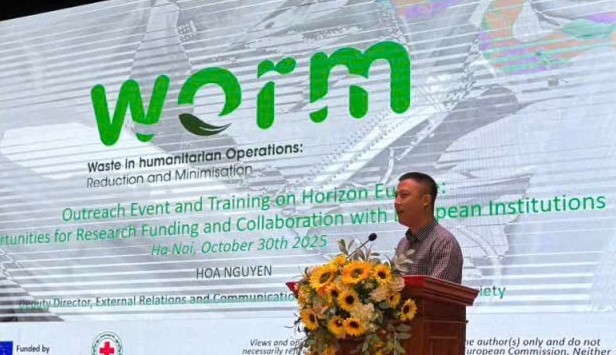 Tại Hội thảo, ông Nguyễn Vĩnh Hòa, Phó Trưởng ban Đối ngoại – Truyền thông, Trung ương Hội Chữ thập đỏ Việt Nam đã chia sẻ kinh nghiệm thực tiễn trong quá trình triển khai Dự án WORM – Giảm thiểu và quản lý rác thải trong hoạt động nhân đạo. Đây là một sáng kiến nằm trong khuôn khổ Chương trình Horizon Europe, hướng tới quản lý rác thải bền vững và phát triển mô hình kinh tế tuần hoàn trong lĩnh vực nhân đạo.