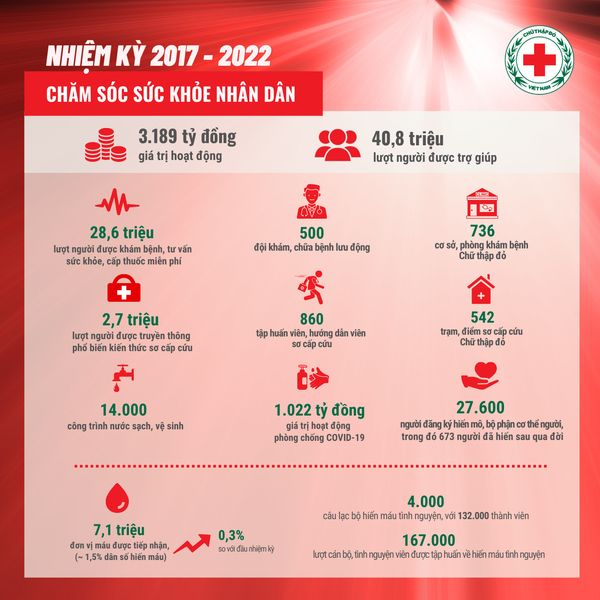 Giá trị hoạt động trong lĩnh vực chăm sóc sức khỏe nhân dân của toàn Hội nhiệm kỳ 2017-2022 đạt trên 3.189 tỷ đồng, trợ giúp cho hơn 40,8 triệu lượt người khó khăn (gấp 1,1 lần về giá trị và gấp 1,85 lần về số người được trợ giúp so với nhiệm kỳ Đại hội IX).