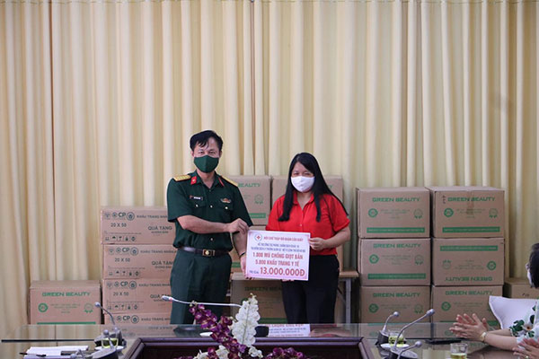 Hội Chữ thập đỏ quận Cầu Giấy, Hà Nội trao tặng 1000 mũ chống giọt bắn, 5000 khẩu trang y tế tại điểm cách ly Trường Quân sự Sơn Tây.