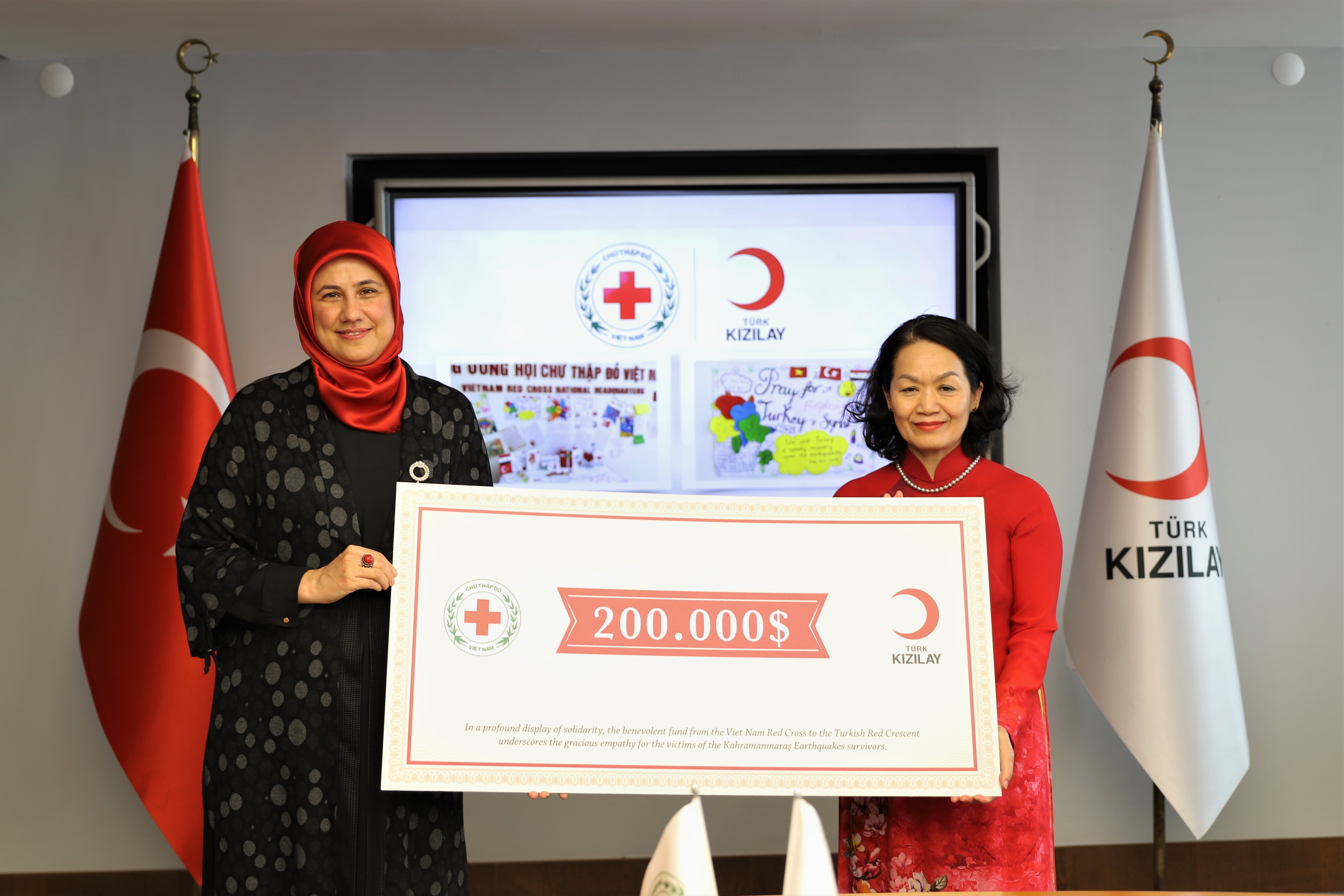 Chủ tịch Hội Chữ thập đỏ Việt Nam trao tặng 200.000 Đô la Mỹ cho Hội Trăng lưỡi liềm đỏ Thổ Nhĩ Kỳ, ủng hộ cho những người bị ảnh hưởng bởi động đất và phục hồi tái thiết sau động đất.