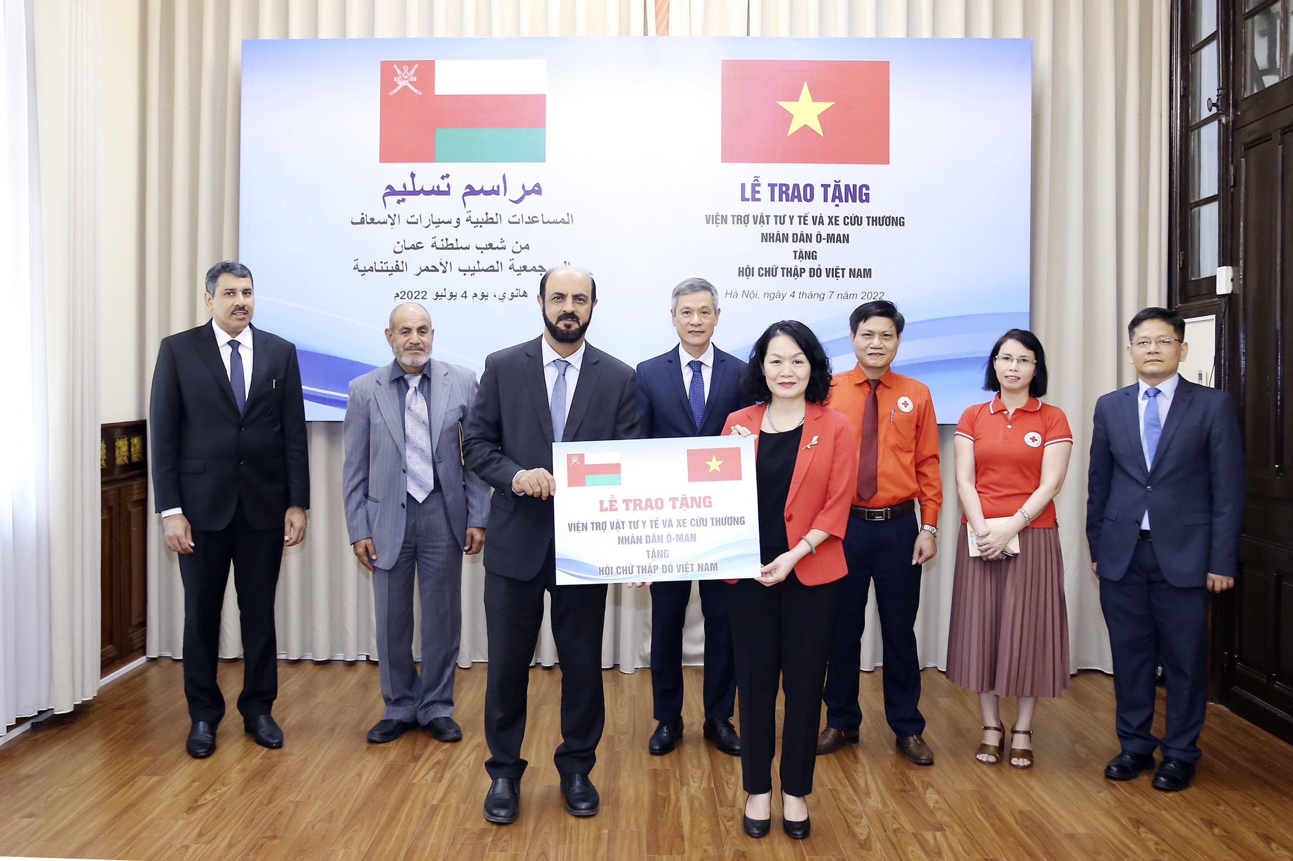 Tham dự lễ tiếp nhận có Chủ tịch Hội Chữ thập đỏ Việt Nam Bùi Thị Hoà; Ngài Saleh Mohammed Ahmed Al-Suqri, Đại sứ Vương quốc Oman tại Việt Nam; Ngài Mohammed Hamoud Said Al-Zahli, Giám đốc điều hành Tổ chức Từ thiện Oman; đại diện Bộ Ngoại giao Việt Nam, Vụ Trung Đông – châu Phi, Bộ Ngoại giao và đại diện lãnh đạo các ban Hội Chữ thập đỏ Việt Nam.