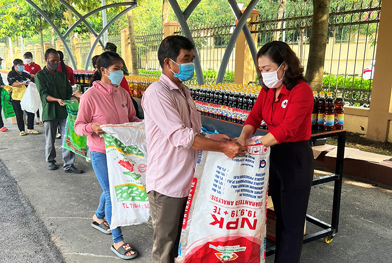Đại diện Hội Chữ thập đỏ trao nhu yếu phẩm cho các gia đình có hoàn cảnh khó