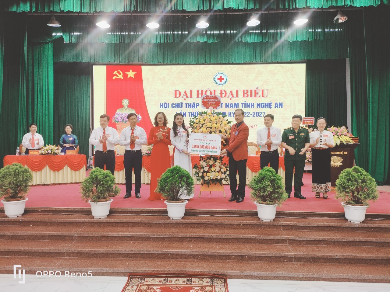 Phó Chủ tịch Trung ương Hội CTĐ Việt Nam Trần Quốc Hùng tặng lẵng hoa chúc mừng Đại hội và trao hỗ trợ 3 tỷ đồng cho các hoạt động nhân đạo của tỉnh Nghệ An.