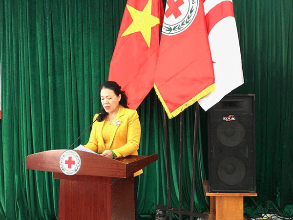 Bà Nguyễn Thị Xuân Thu, Chủ tịch Hội Chữ thập đỏ Việt Nam phát biểu tại hội nghị.