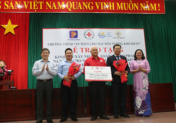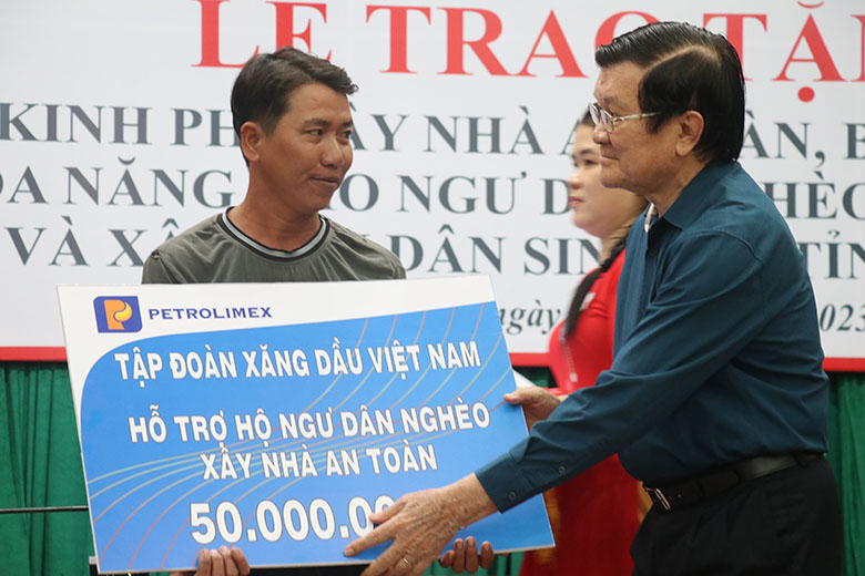 Nguyên Chủ tịch nước – nguyên Chủ tịch danh dự Hội Chữ thập đỏ Việt Nam Trương Tấn Sang trao bảng tượng trưng hỗ trợ xây nhà an toàn cho ngư dân nghèo