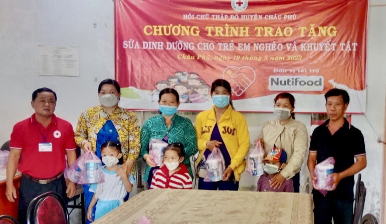 Ông Trần Ngọc Phương – Chủ tịch Hội Chữ thập đỏ huyện Châu Phú trao sữa cho trẻ em.