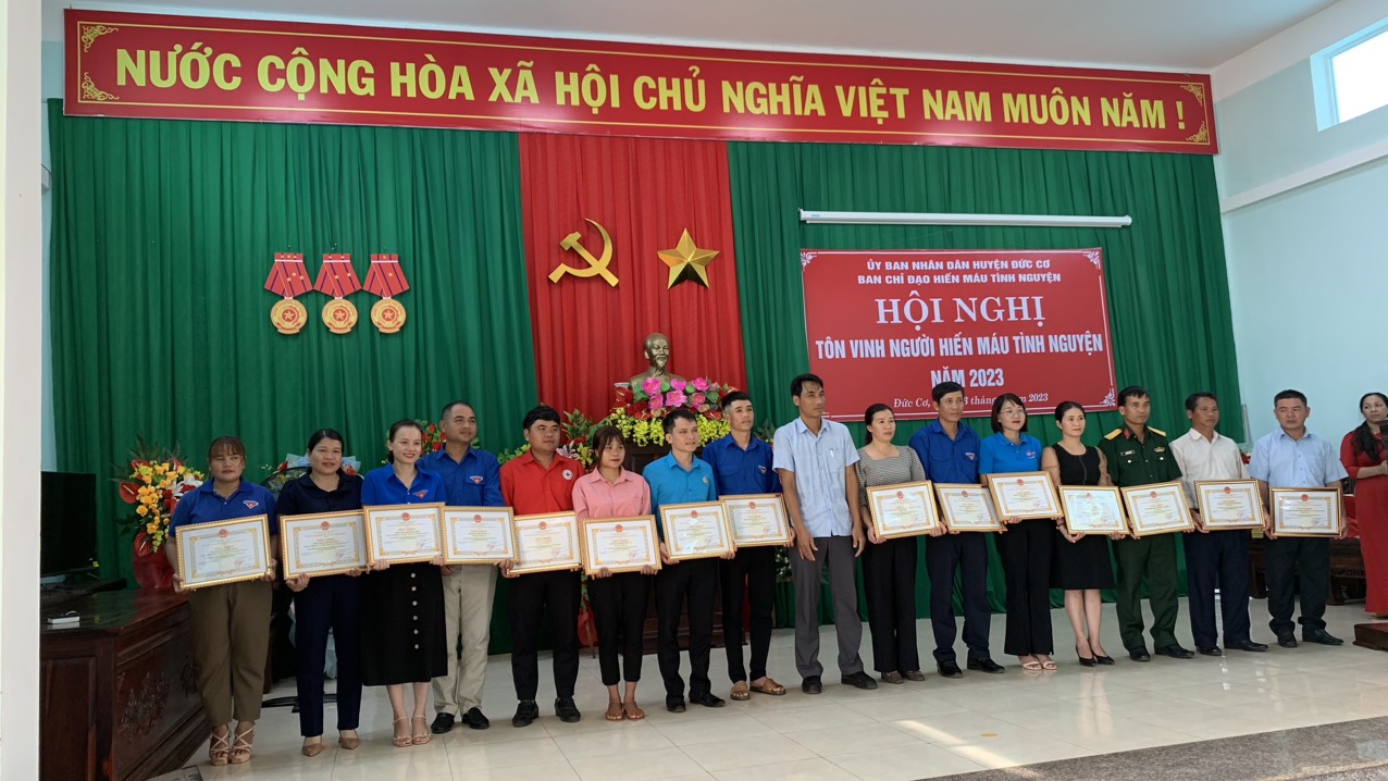 Dịp này, UBND huyện Đức Cơ đã tặng giấy khen cho 16 tập thể, 9 cá nhân, Ban chỉ đạo vận động hiến máu tình nguyện huyện tặng giấy khen cho 3 tập thể và 27 cá nhân đạt thành tích xuất sắc trong phong trào hiến máu tình nguyện, đồng thời tôn vinh 3 cá nhân tiêu biểu nhất nhiều lần tham gia hiến máu tình nguyện năm 2023.