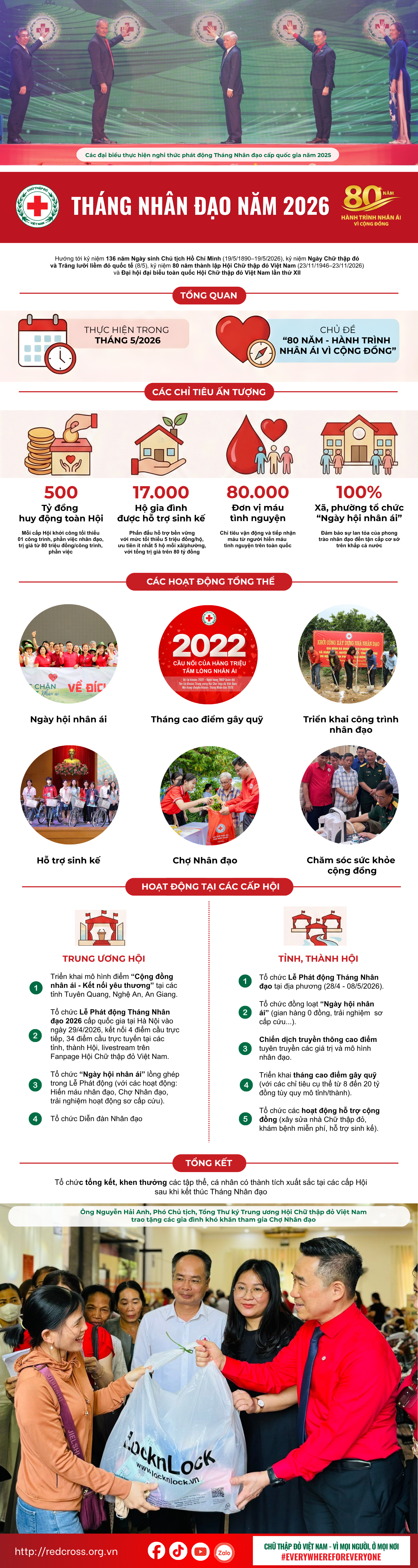 Infographic: Tháng Nhân đạo năm 2026 với chủ đề ” 80 năm – Hành trình nhân ái vì cộng đồng” 25/04/2026 - 10:04 24 Tin liên quan Chủ động hành động sớm – nâng cao năng lực ứng phó thảm họa trong bối cảnh biến đổi khí hậu Hội nghị lần thứ Tám Ban Thường vụ Trung ương Hội Chữ thập đỏ Việt Nam khóa XI: Xây dựng tầm nhìn chiến lược cho nhiệm kỳ mới Thái Nguyên: Gần 8 tỷ đồng chung tay vì người yếu thế trong “Tháng Nhân đạo” 2026 Trung ương Hội Chữ thập đỏ Việt Nam gặp mặt báo chí thông tin về Tháng Nhân đạo năm 2026 Thúc đẩy mô hình “kinh tế nhân đạo” hướng đến hỗ trợ bền vững cho người dân